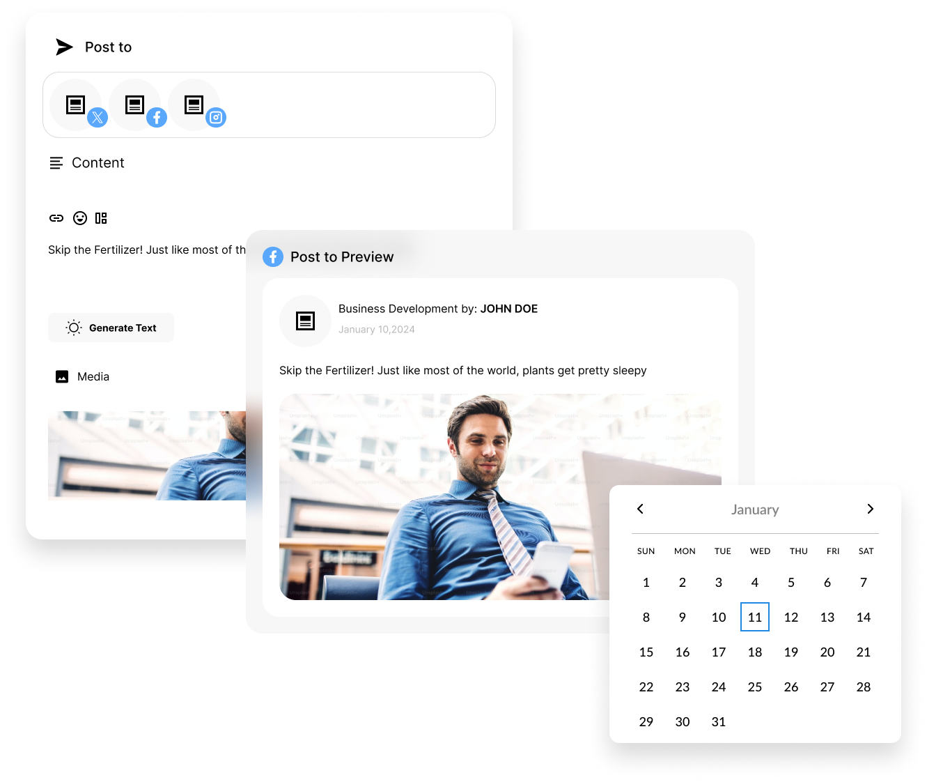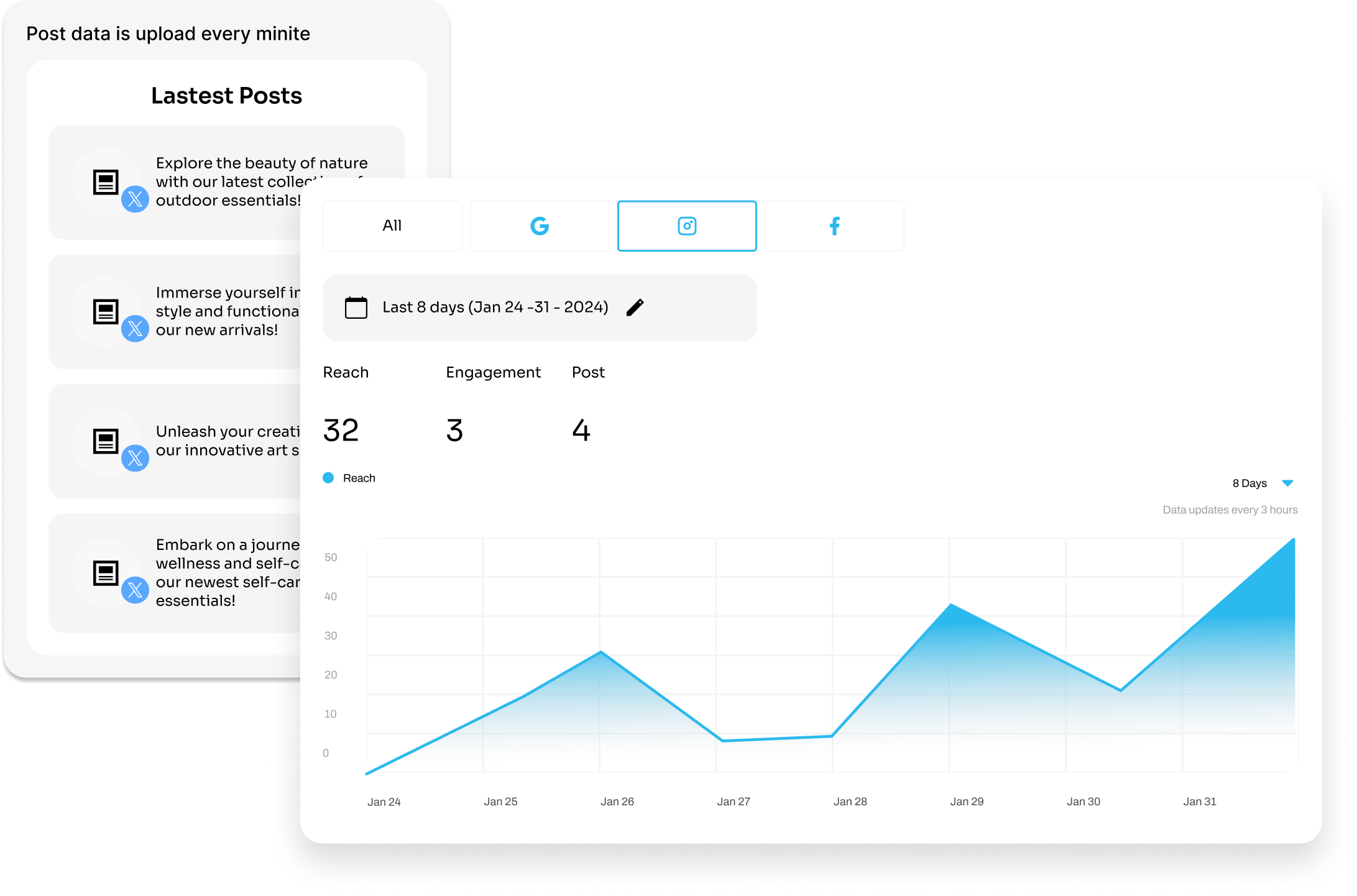 Six seamlessly integrated profiles: Facebook, Google Business, X, Instagram, LinkedIn. Effortlessly navigate and optimize your presence across these diverse platforms from one unified hub.